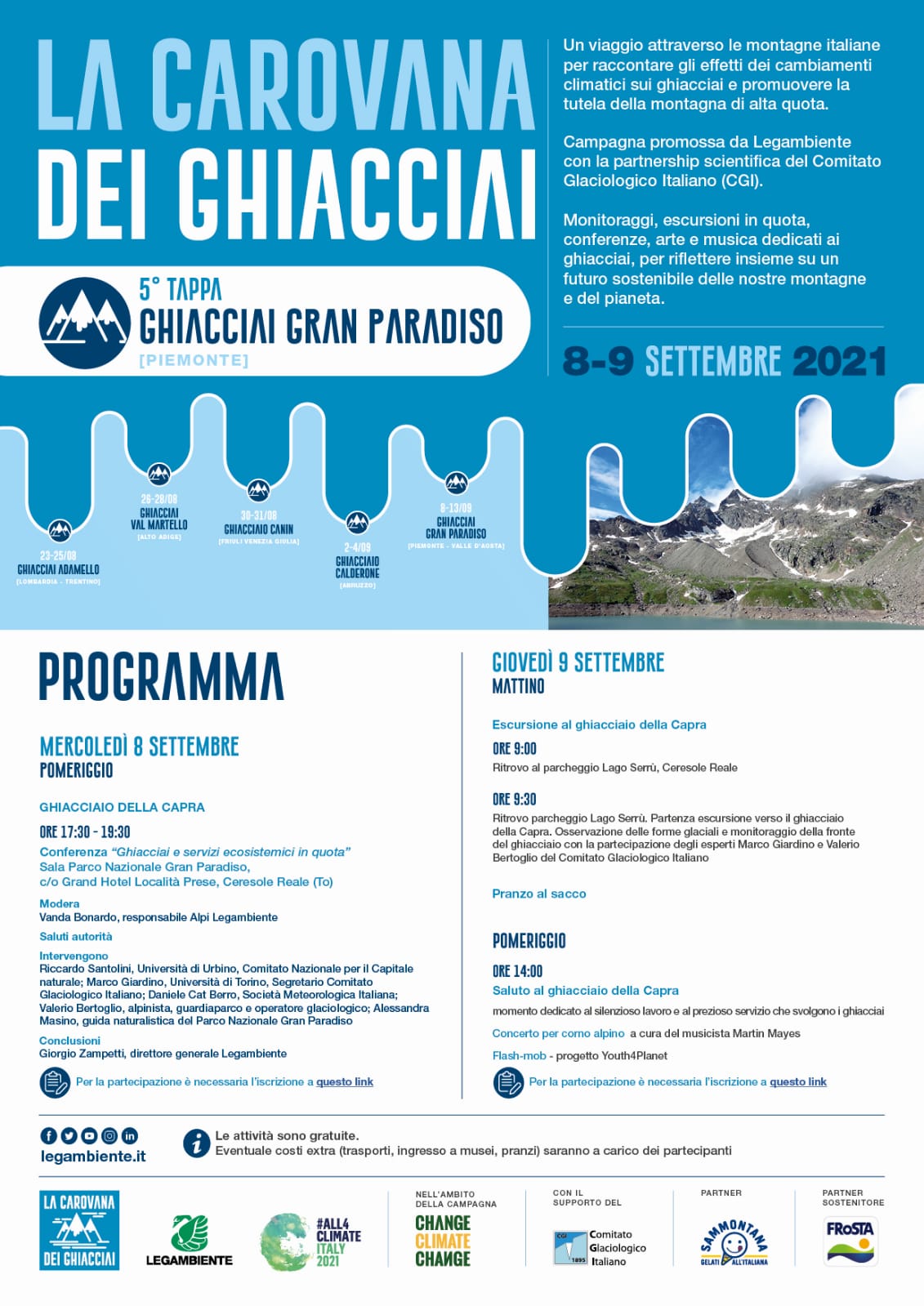 Dal 23 agosto al 13 settembre 2021 torna in quota per il secondo anno Carovana dei ghiacciai, la campagna ideata e promossa da Legambiente in collaborazione con il Comitato Glaciologico Italiano, per monitorare la salute dei ghiacciai messa a serio rischio dagli effetti dei mutamenti climatici.