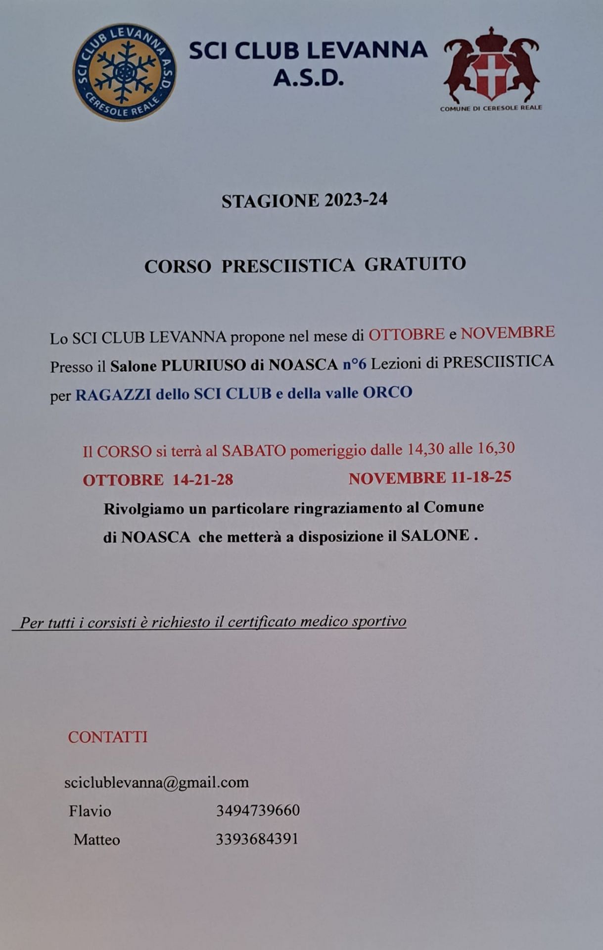 Il corso di ginnastica presciistica si terrà il SABATO POMERIGGIO nei mesi di ottobre e novembre.
