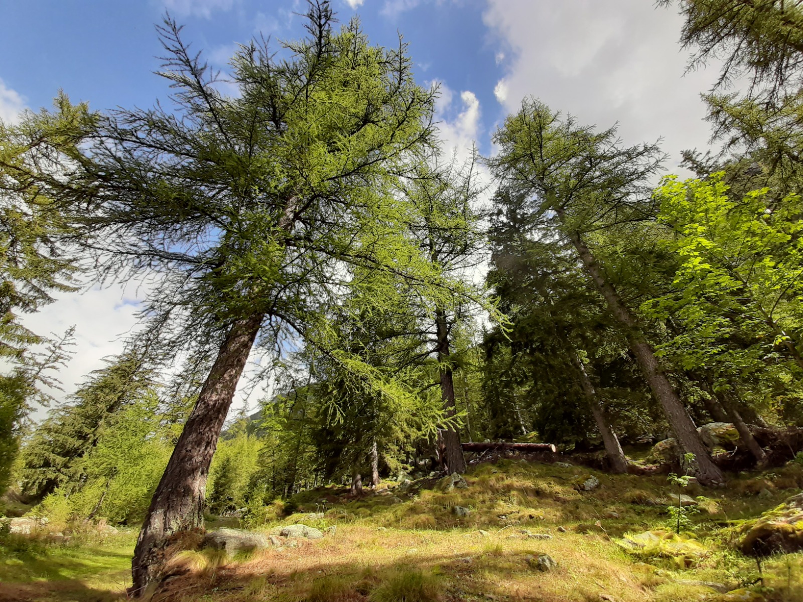 Escursione lungo un antico sentiero che risale il versante “all’inverso” attraverso boschi di larici e abeti rossi, piccole radure, e rocce lavorate dagli antichi ghiacciai che formano spettacolari balconi sulla valle.