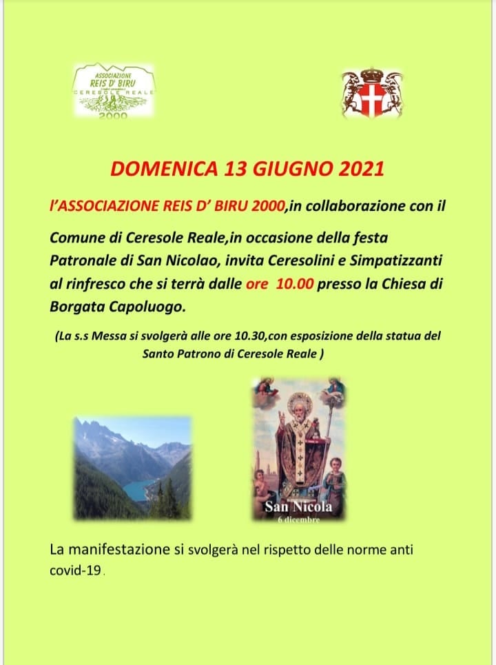 L'Associazione Reis d' Biru 2000, in collaborazione con il Comune di Ceresole Reale, in occasione della festa patronale di San Nicolao invita Ceresolini e Simpatizzanti al rinfresco che si terrà dalle ore 10,00 presso la Chiesa parrocchiale, in Borgata Capoluogo.