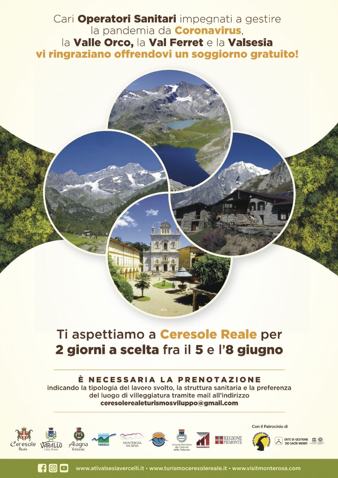 Da venerdì 5 a lunedì 8 giugno 2020 Ceresole Reale accoglierà gratuitamente 150 sanitari coinvolti nella pandemia da Covid 19. Da venerdi 12 a domenica 14 giugno 80 sanitari saranno accolti dalla val Ferret. Dal 20 al 26 giugno altri 80 sanitari saranno ospiti della Valsesia