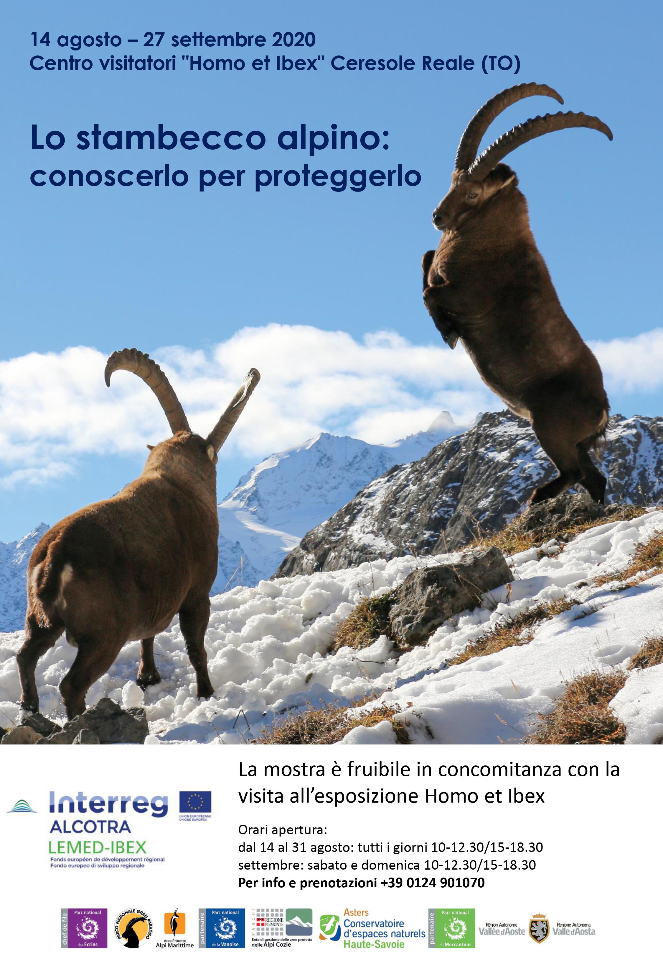 Da venerdì 14 agosto sarà esposta nella sala polivalente del centro visitatori del Parco "Homo et Ibex" di Ceresole Reale (TO) la mostra "Lo stambecco Alpino: conoscerlo per proteggerlo" prodotta nell'ambito del progetto Interreg Alcotra LEMED-IBEX. L'esposizione, frutto della collaborazione con il Parc National des Ecrins, capofila del progetto, racconta la biologia e la storia dello stambecco e approfondisce in modo particolare le minacce per la conservazione di questa maestosa specie e le azioni intraprese per la sua salvaguardia.