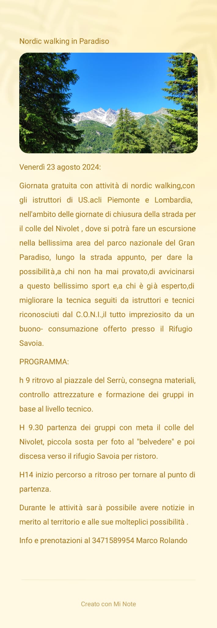 Giornata gratuita con attività di nordic walking,con gli istruttori di US ACLI Piemonte e Lombardia, nell'ambito delle giornate di chiusura della strada per il colle del Nivolet, con escursione nel Parco lungo la SP 50 per il Nivolet, per dare la possibilità a chi non ha mai provato di avvicinarsi a questo bellissimo sport e, a chi è già esperto, di migliorare la tecnica seguiti da istruttori e tecnici riconosciuti dal C.O.N.l.