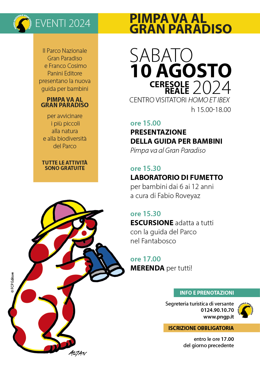 Pimpa va al Gran Paradiso è la nuova guida, pubblicata con l’intento di avvicinare i più piccoli alla natura e alla biodiversità del Parco. La collaborazione tra l'Ente Parco e Franco Cosimo Panini Editore nonché il personaggio e le illustrazioni di Francesco Tullio-Altan hanno prodotto questo gioiellino della letteratura per bambini attenta all'ambiente. In tale occasione il libro verrà presentato al pubblico. Per celebrare meglio l'occasione ci sarà un laboratorio di fumetti per bambini con l'artista Fabio Roveyaz, una passeggiata guidata con le guide del Parco ed una buona merenda offerta dal Parco.