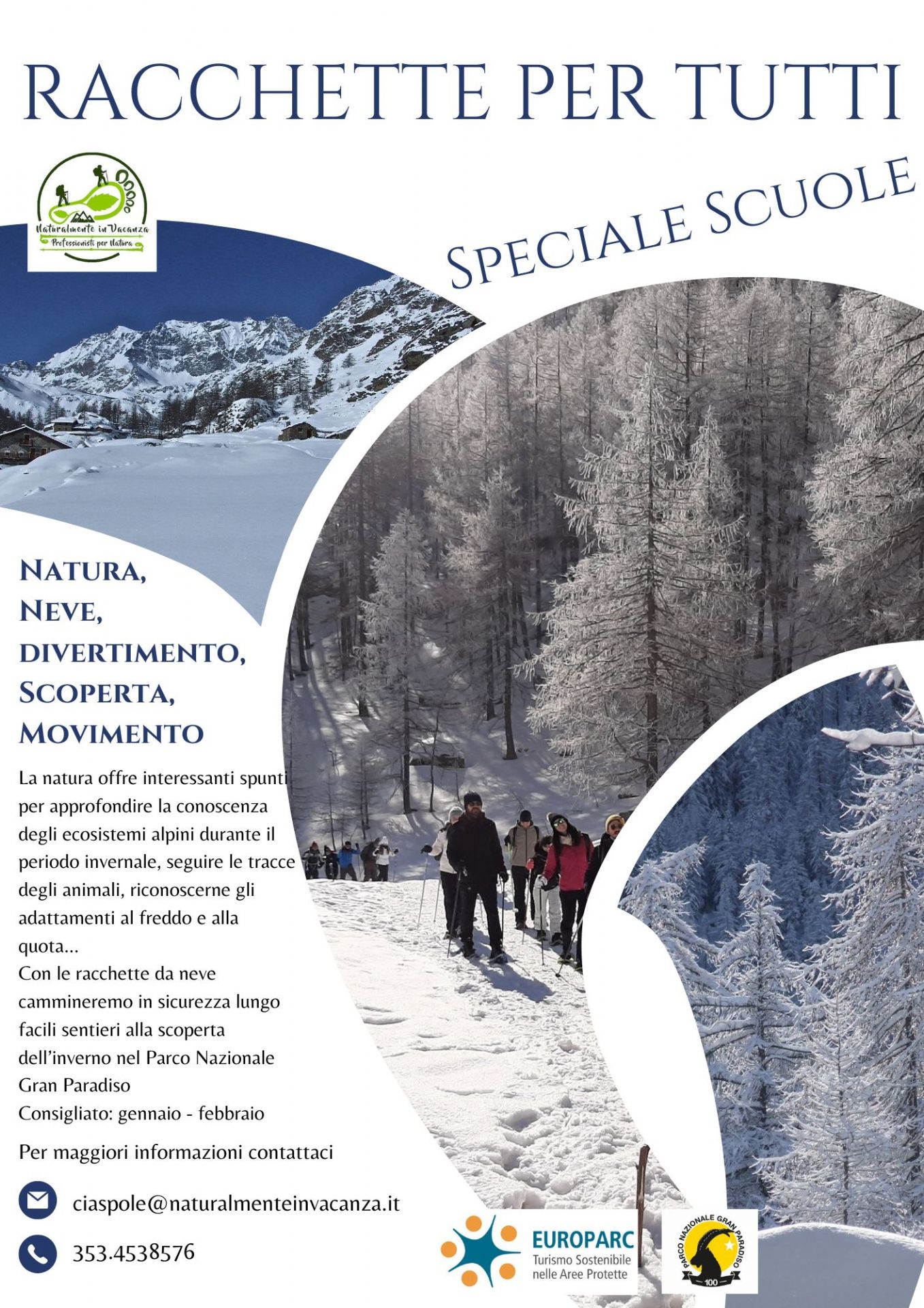 Con le racchette da neve cammineremo in sicurezza lungo facili sentieri alla scoperta della natura del Parco Nazionale Gran Paradiso in inverno.