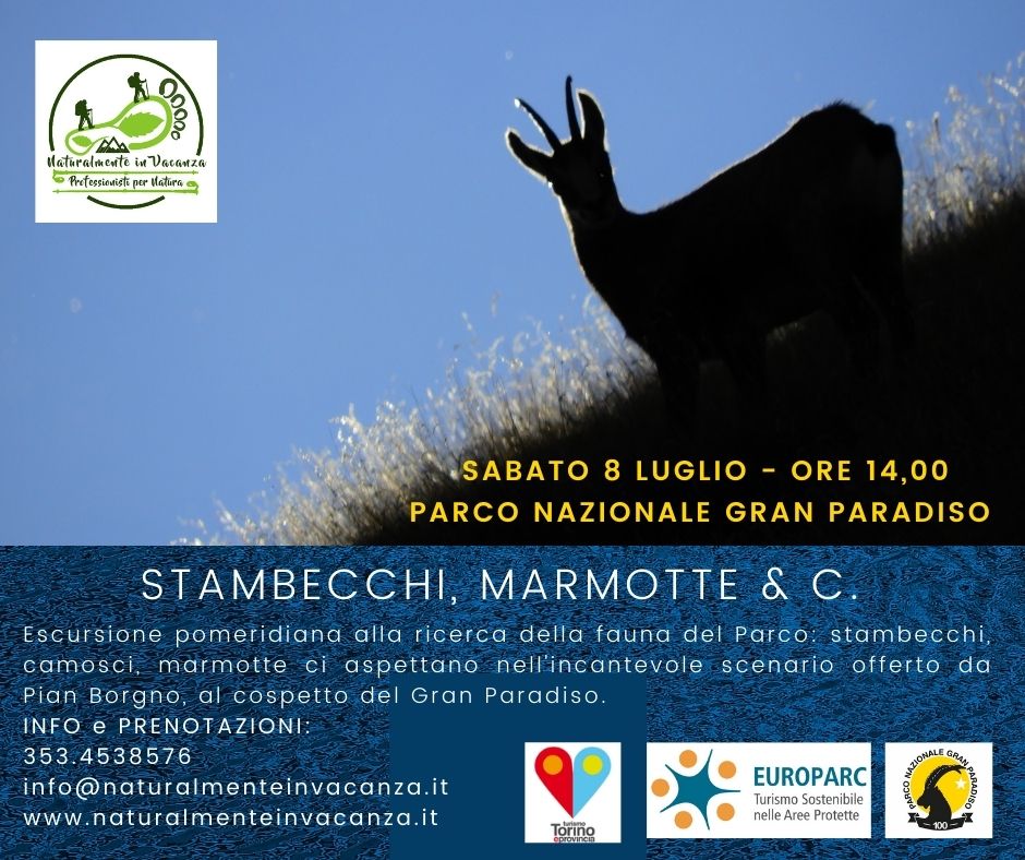 Escursione pomeridiana alla ricerca della fauna del Parco: stambecchi, camosci, marmotte... ci attendono nell'incantevole scenario offerto da Pian Borgno, al cospetto del Gran Paradiso.