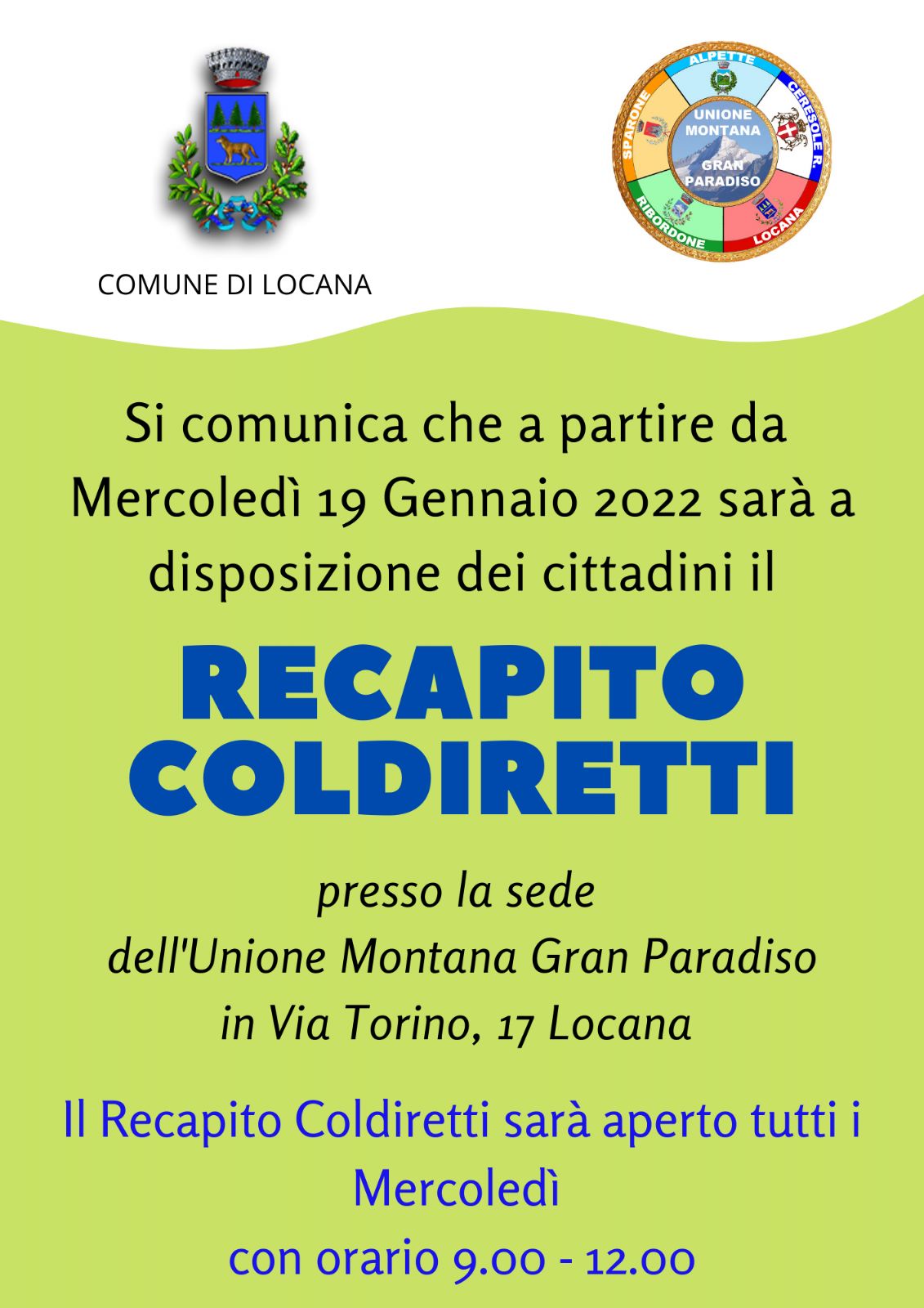 RECAPITO COLDIRETTI presso la sede dell'Unione Montana Gran Paradiso in Via Torino, 17 Locana