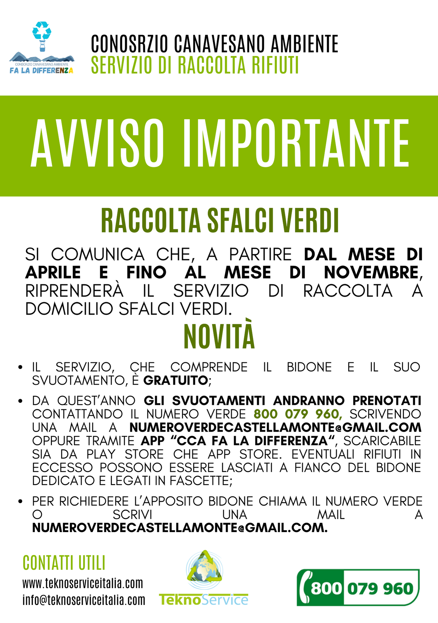 Si comunica che il servizio di raccolta a domicilio sfalci verdi sarà attivo dal mese di Aprile fino a Novembre.