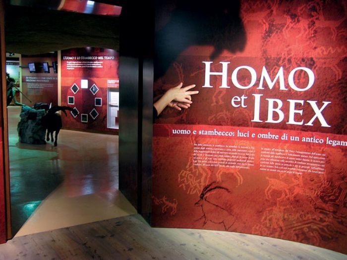 Il tema centrale dell'esposizione è il rapporto tra l’uomo e lo stambecco nella storia e nell’arte fino ai giorni nostri. Interessanti sono gli strumenti multimediali a disposizione del visitatore e le ricostruzioni, come i pannelli che ricreano una grotta con graffiti preistorici raffiguranti i primi stambecchi e scene di caccia dell’epoca.